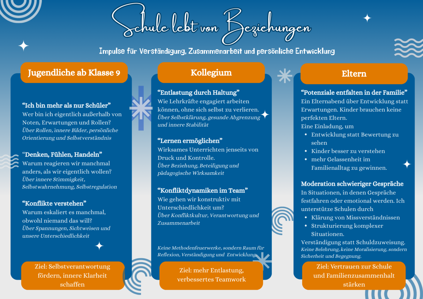 Wo Menschen zusammenarbeiten, entstehen Spannungen. Entscheidend ist, wie wir damit umgehen. Ich begleite Schulen bei der Klärung festgefahrener Situationen und moderiere Gespräche zwischen Lehrkräften, Eltern oder Teams – damit Verständnis entstehen und Zusammenarbeit wieder möglich werden kann.